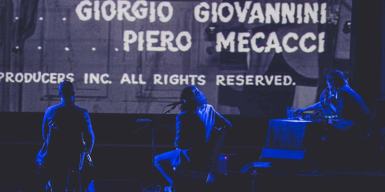 The black and white film rolled on while bathed in blue, as the band shifted tones and moods that lined up with dystopian scenes. The Nunnery (Sarah Elstran) added gentle hums and looping soft drum beats in the moments of tender loss onscreen. Al leaned back and forth between his magical board of pedals and volume control over the dialogue being shown on screen.