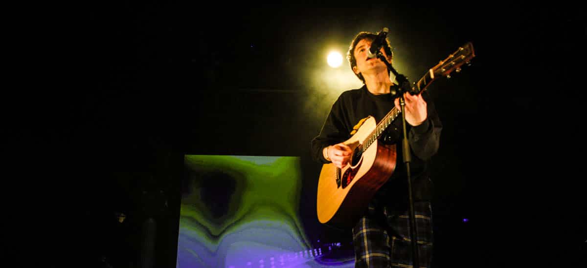 The night’s setlist started with the driving, circular riffs of “Outrunning Karma,” for which the tour is named. Onstage with only his drummer, a synth keyboardist and a handful of picks jammed into his acoustic guitar, Benjamin was all set to bring the rest of his 2018 album, Narrated For You, to life.