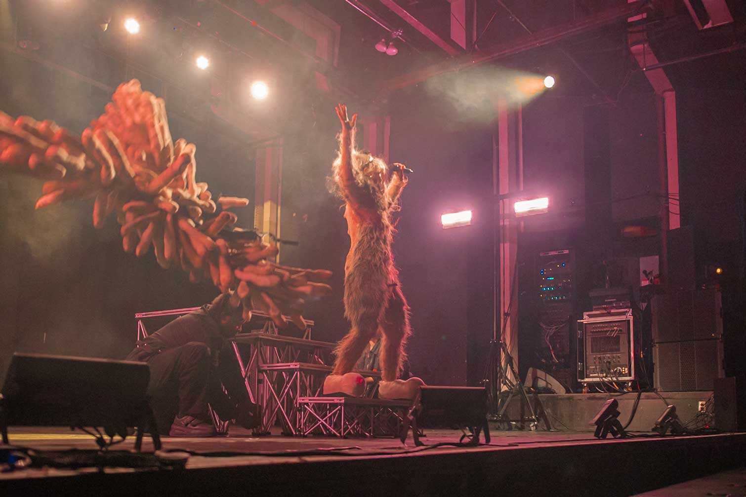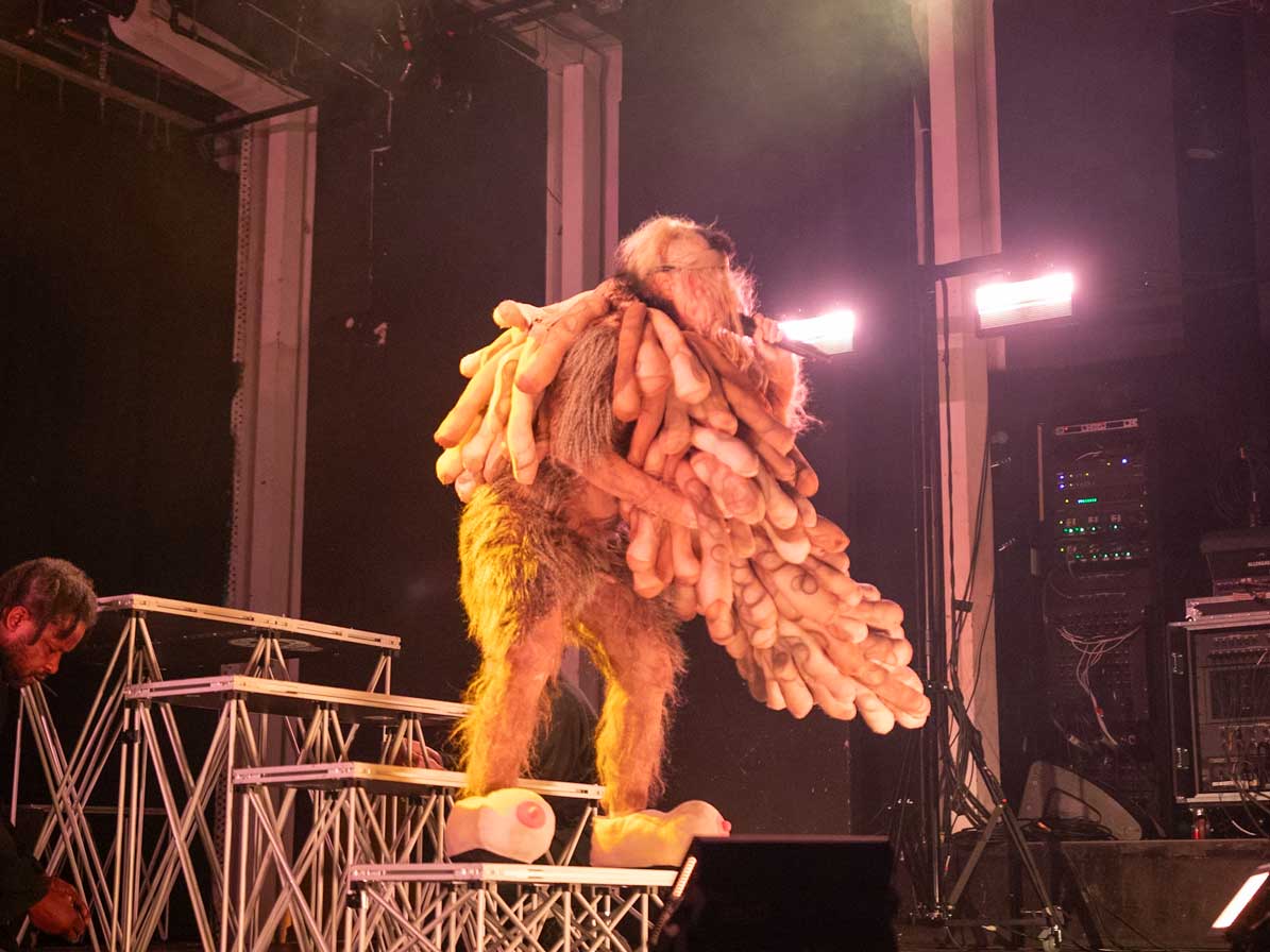 Two dancers flanked her in complementary, albeit greatly subdued costumes. They would leave and return throughout the show in similar capacities wearing matching hair suits or even paper mache vaginas.
