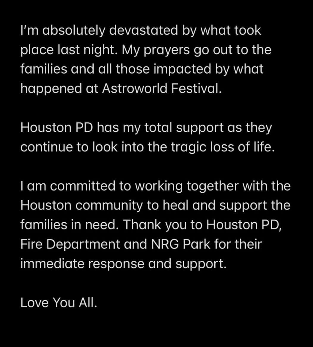 In response to the devastation, Travis Scott canceled what remained of Astroworld both on Friday night, and the entire concert for Saturday. He tweeted the following: